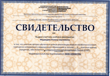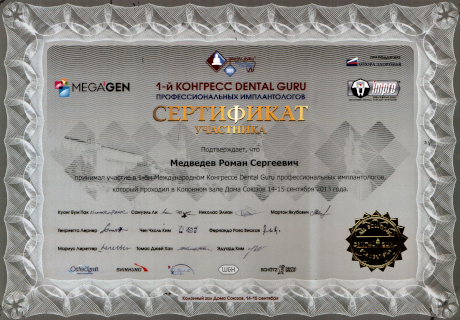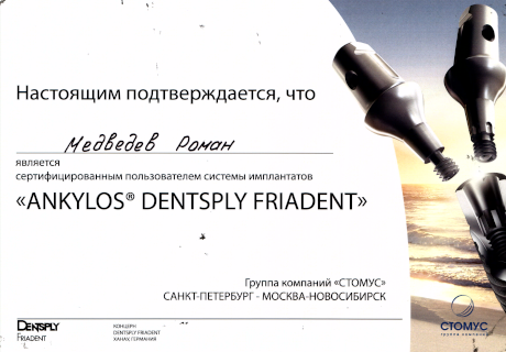 Роман Сергеевич Медведев — высококвалифицированный врач с «Большой буквы!», ответственный, порядочный, внимательный, талантливый. Очень любит свою работу. Бережно, с уважением относится к каждому пациенту, поможет решить вашу проблему. Счастливые пациенты — это пациенты Медведева. Как хирург — имплантолог доктор проводит операции по имплантации зубов, включая операции «Oll-on4», операции по костной пластики; синус-лифтинг, пластику мягких тканей; безупречно и быстро, главное безболезненно, удаляет ретинированные, дистопированные зубы. Стоматолог — ортопед Роман Сергеевич подарит Вам сияющую улыбку, протезируя винирами, люминирами, цельнокерамическими и цирконевыми коронками. Доктор проводит все виды протезирования включая установку несъемных ортопедических конструкций с опорой